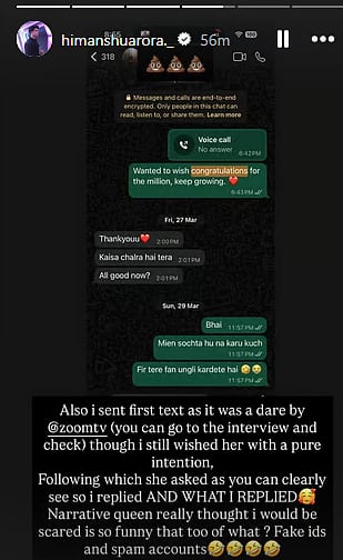 Responding to this, Himanshu shared a screenshot of his chat and said that his point had been misrepresented. He said that his first message was just to congratulate Akanksha on reaching one million followers. He said, “Wanted to wish congratulations on the million, keep going.” After this, the conversation proceeded in the usual way, but it was shown differently. …read more